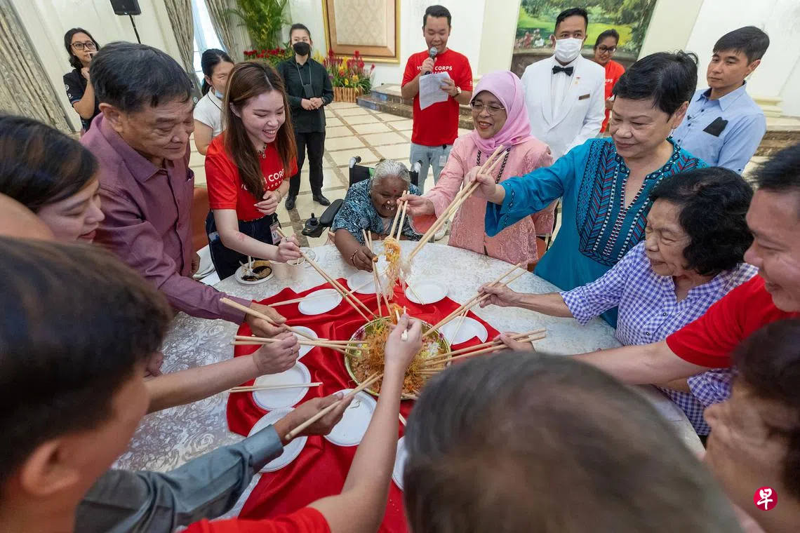 大约30名来自狮子乐龄之友协会(Lions Befrienders)的年长者星期三(2月1日)受邀到总统府,与哈莉玛总统一起捞鱼生、吃早餐、折彩纸,共度特别的一天。