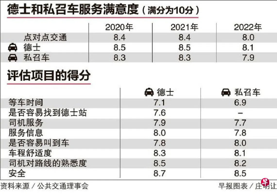 公交理事会调查显示,对点对点交通服务满意的乘客,从2021年的97.5%下滑至95.2%。德士和私召车的平均得分为8.1分和7.9分,低于前一年的8.5分和8.3分。