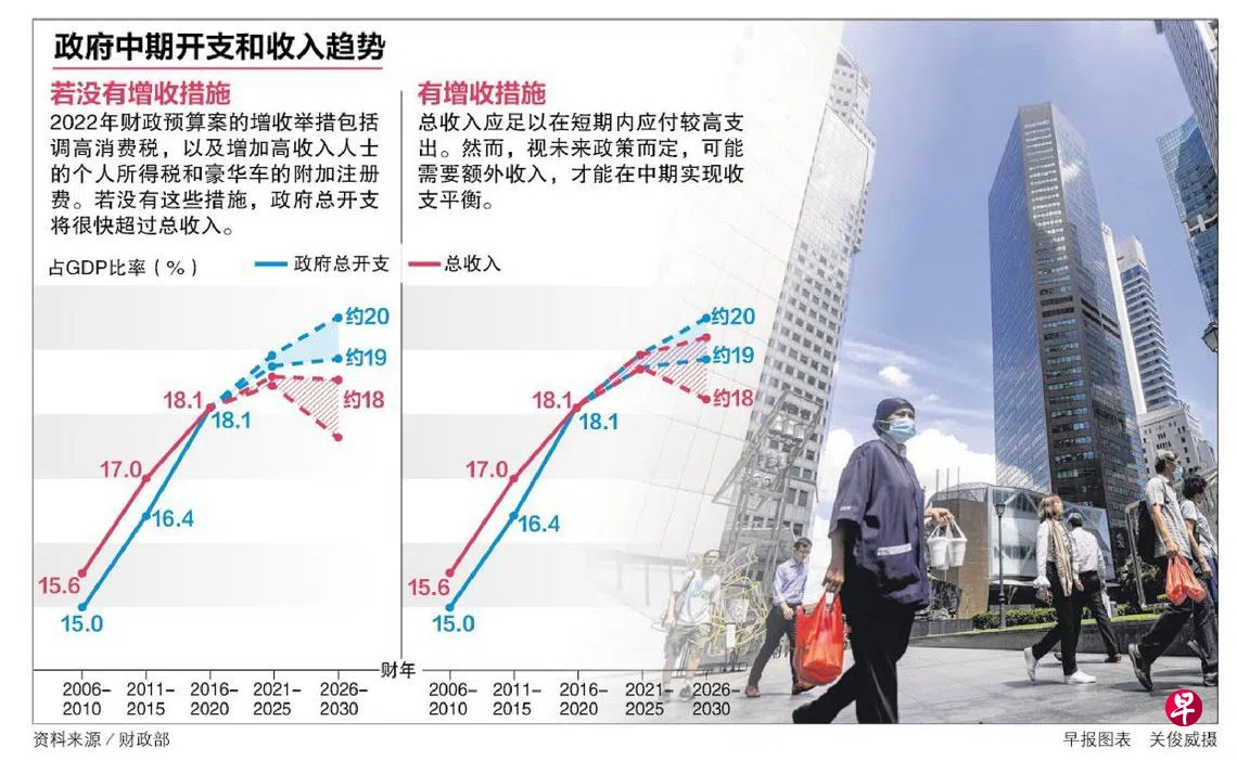 政府开支不断增加,到2030财年可能占国内生产总值的20%以上,收入却未必跟上。调高消费税等增收措施虽然可填补收支缺口,但政府若要推出政策提高国家经济竞争力和加强社会契约,须有额外的财政资源,才能在中期实现收支平衡。