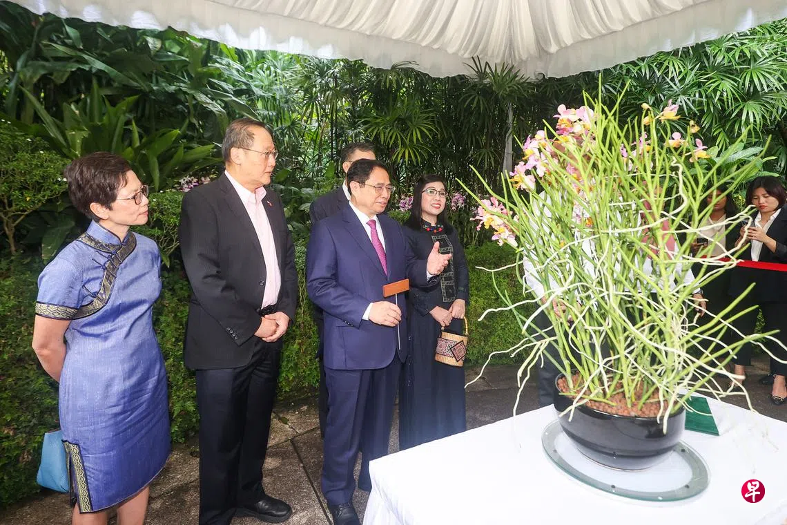 越南总理范明政(右二)和夫人黎氏碧珍(右一)星期四(2月9日)上午,在人力部长兼贸工部第二部长陈诗龙医生(左二)与夫人陈幼星医生(左一)陪同下,到国家胡姬园出席胡姬花命名仪式,观赏以他们的名字命名的配种胡姬花。