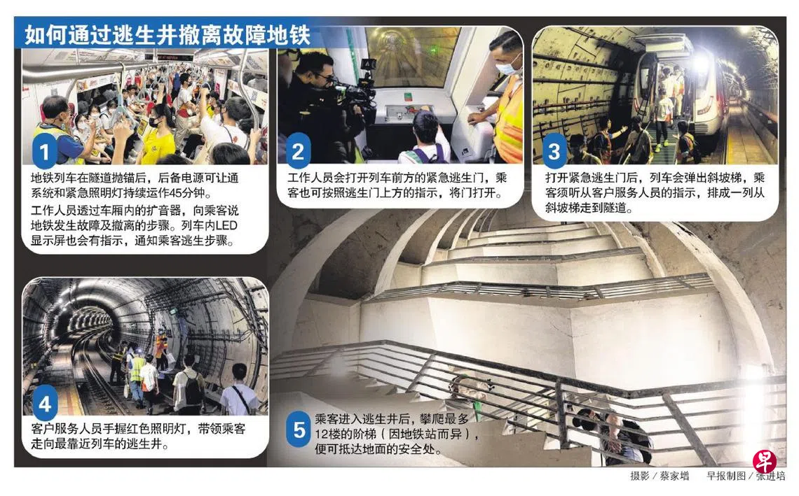 地铁列车在地下隧道抛锚后,通风系统可持续运作45分钟,所有乘客能在30分钟内从隧道的逃生井安全撤离。