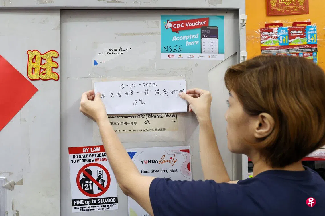 政府从星期二(2月14日)起调高烟草税15%,部分邻里香烟零售店隔天就相应调高香烟售价,每包香烟涨了约1元三角至1元五角。