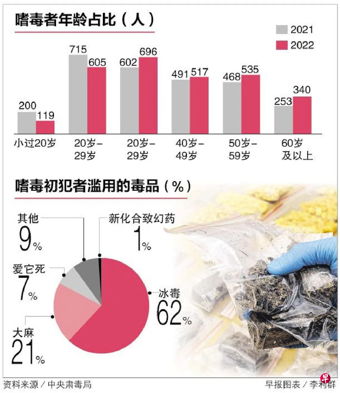中央肃毒局星期三(2月15日)公布2022年肃毒数据,当局去年逮捕2812名嗜毒者,比2021年的2729人微增3%。初犯者占约28%,共797人,比前年的936人少约15%;重犯者有2015人,比前年的1793人多12%。