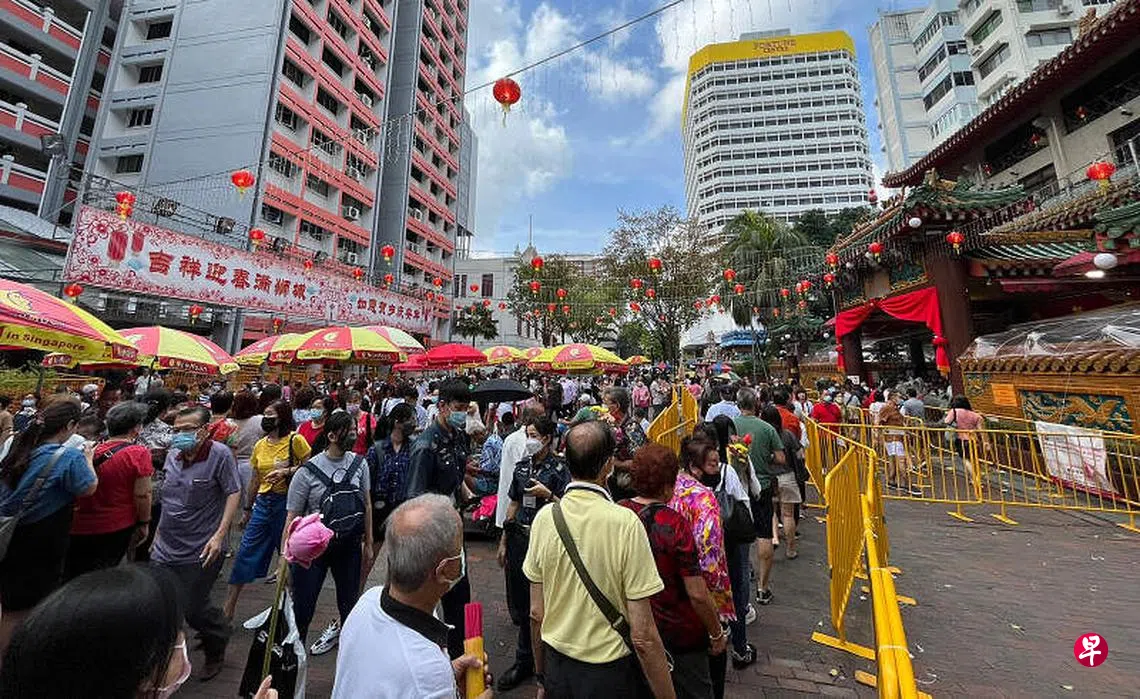 《新明日报》记者星期四早上约10时抵达时,已有上千人在庙外排队,一度看不见排队队伍的尽头。庙外除了等候入内的人群和叫卖的流动花摊,也有多名辅警协助维持秩序。