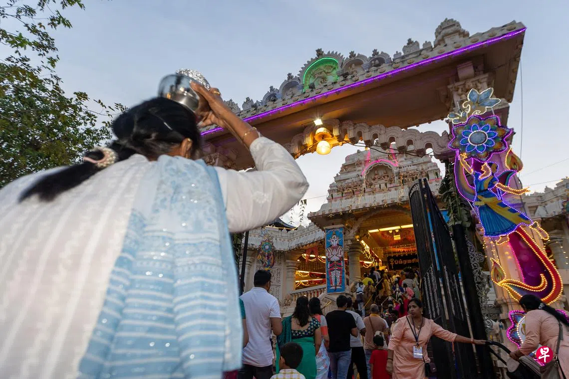 随着活动开始,信徒们手持牛奶壶,井然有序地进入庙内,一一为神像沐浴牛奶,以及在神像前供奉鲜花和水果等祭品。