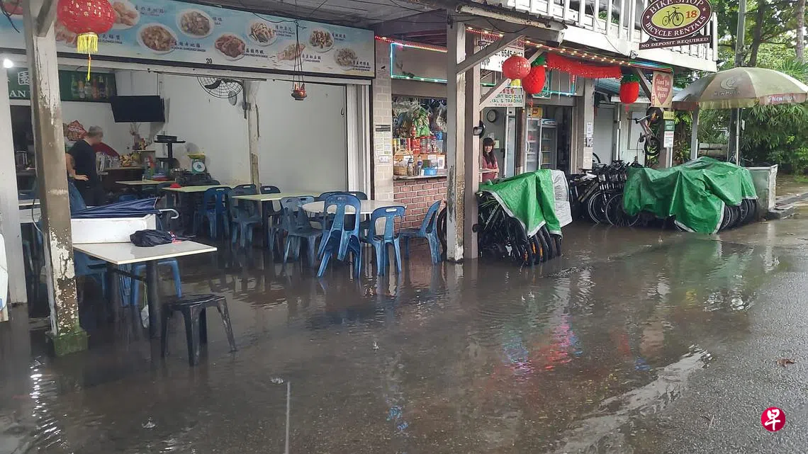 靠近乌敏岛码头的惹兰贝干乌敏商店街,近三年来不时出现突发性淹水,最近一次在本月12日。大雨倾盆,沟渠疑因排水口被沙石堵着而流速缓慢,导致街道积水流进店屋内,甚至淹过脚踝。