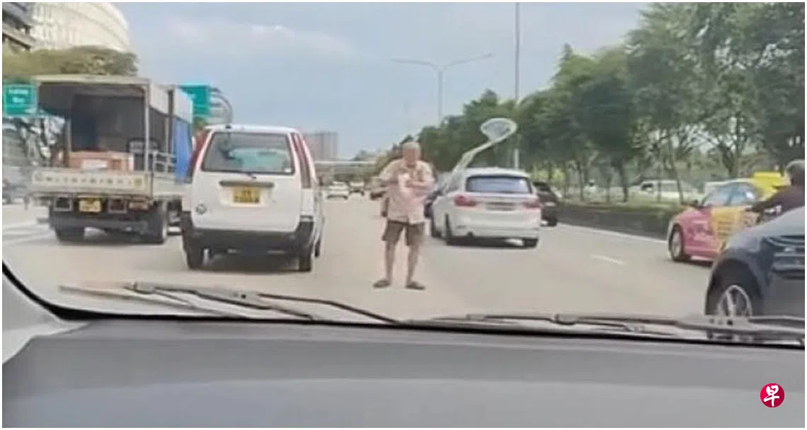 脸书专页SG Road Vigilante上载了一名女乘客拍下的视频。画面显示,该路段共有四条车道,在第三条车道中央,停着一辆白色丰田货车,一名身穿格子衬衫的老汉手持纸张,往第二条车道的后方车辆走去并试着问路。