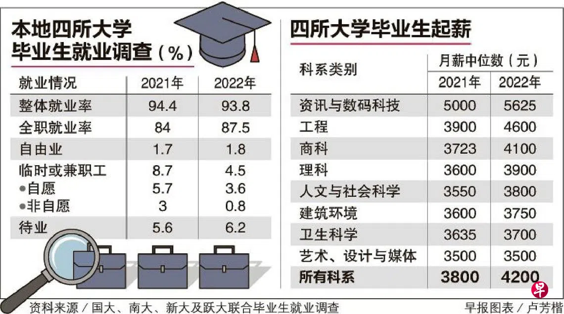整体而言,即包括兼职和自由从业者在内,去年四所大学的毕业生有93.8%在毕业后半年内找到工作,比率略低于前年的94.4%。