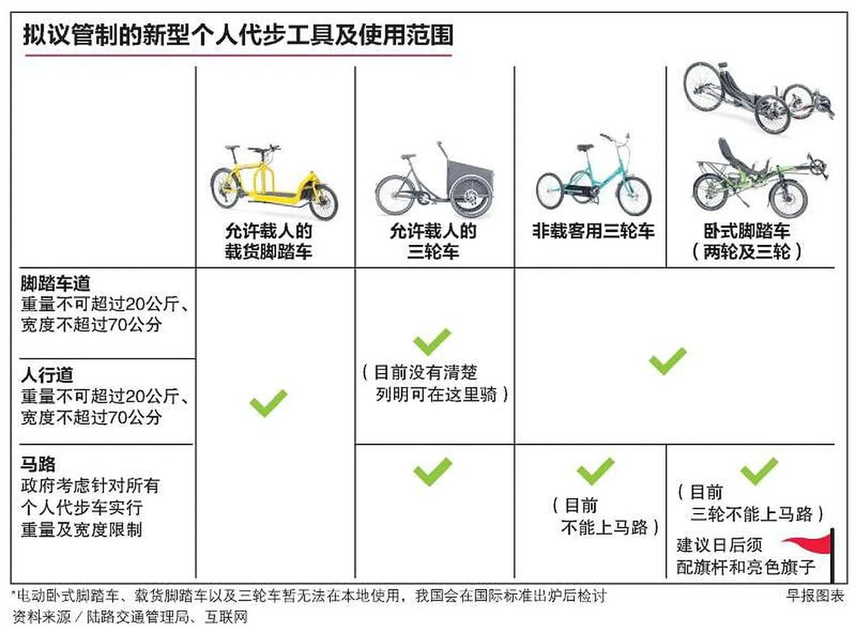 本地有一些人开始使用卧式脚踏车、载货脚踏车及三轮车等较新型的个人代步工具。为了确保安全,活跃通勤咨询小组建议这类代步车重量不可超过20公斤、宽度不超过70公分,才能在人行道与骑行道上通行。