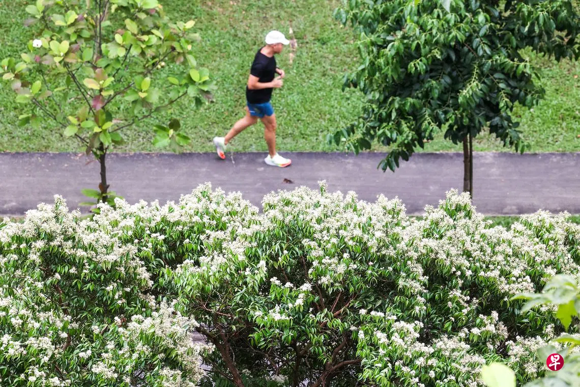 本月首两周,许多地区在下午和傍晚时分下雷阵雨,为本地热带天气注入一丝清凉,蔡厝港弯和蔡厝港北7路一带的锡兰蒲桃树(Syzygium zeylanicum)雨后绽放白色小花朵,树梢仿佛涂上一层“白霜”。