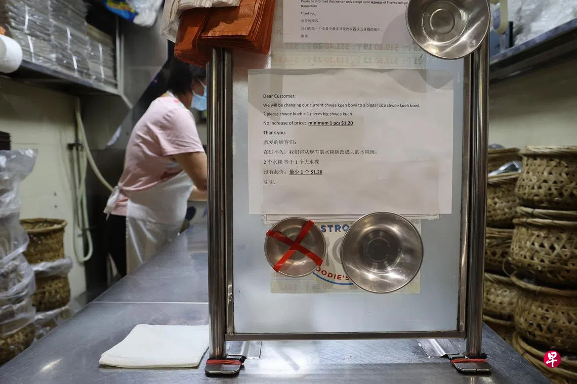 著名水粿档的水粿由小变大,价格也从6角涨至1元2角,老板受访称份量不减,是“二合为一”,只因人手不足,这么做每天可少洗至少5000个碗。
