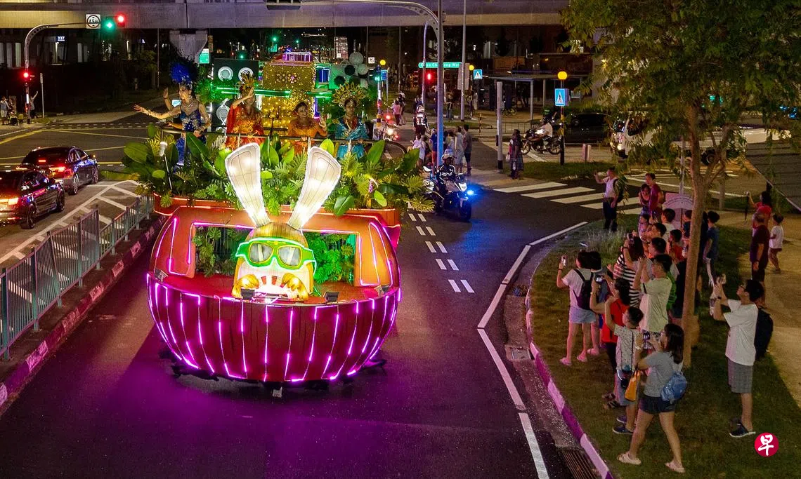 在夜幕的映衬下,深入社区的巨型妆艺花车游行显得格外耀眼。沿途的居民都带着一家老小与基层领袖们热情互动,其乐融融。