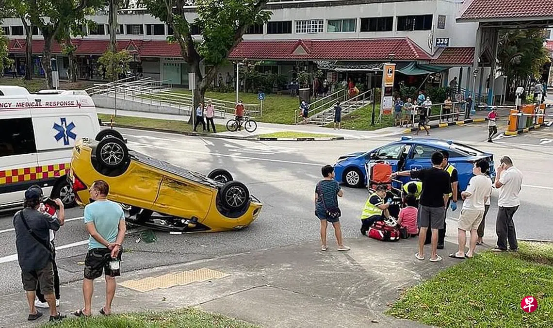轿车与德士在宏茂桥组屋停车场的出入口相撞,轿车四轮朝天,一男一女从里头爬出来后,竟弃车逃跑,德士司机与其79岁母亲则受伤送院。
