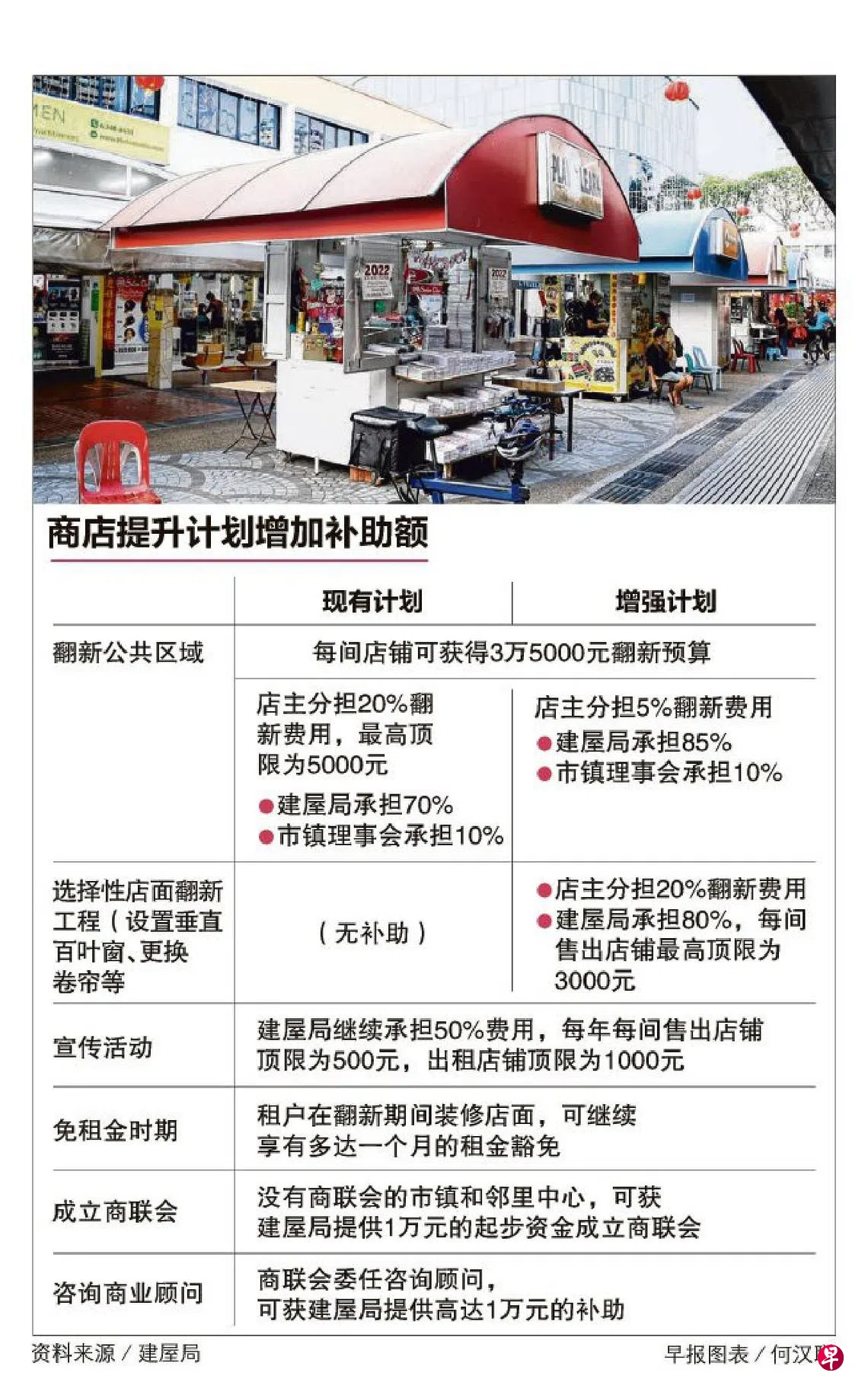 每个店铺的翻新预算仍维持在3万5000元,但店主只需分担翻新费用的5%,建屋局和市镇理事会分别承担其余的85%和10%。有意改善商店门外设施的个别店主也能获得额外补助,建屋局会承担80%的费用,每个出售店铺顶限为3000元。