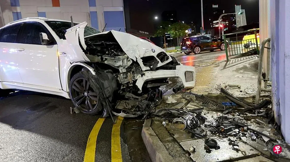 疑为闪躲车辆,宝马失控撞廉价酒店外墙和围栏,围栏飞脱后砸碎便利店玻璃门,一路人被波及受伤,加上驾驶者和乘客,共有四人送院。