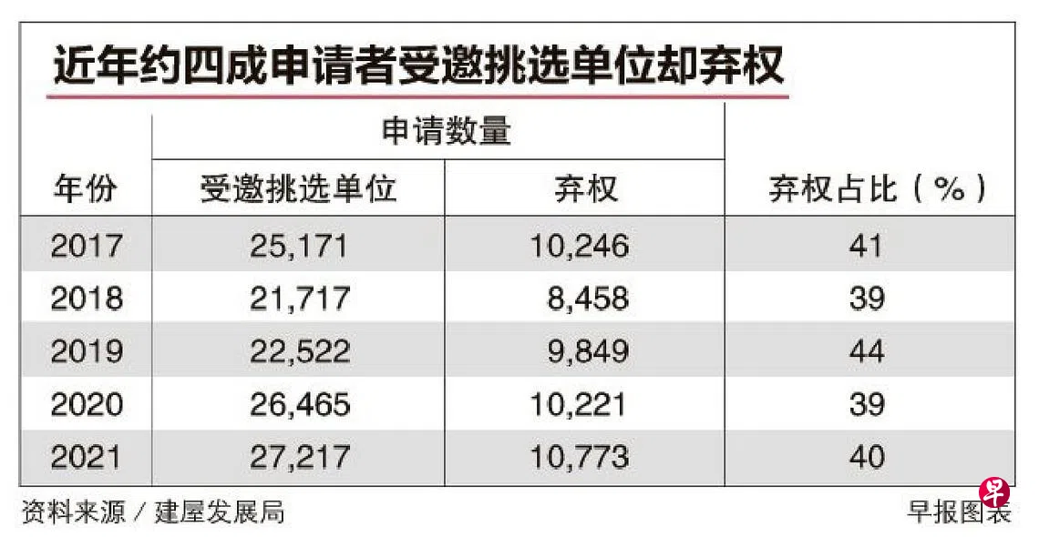 根据建屋发展局提供的数据,2017年至2021年间,受邀挑选单位却弃权的比率维持在39%至44%之间。这相当于每年约有8500组到1万零700组申请者抽中挑选单位的机会,却选择放弃。