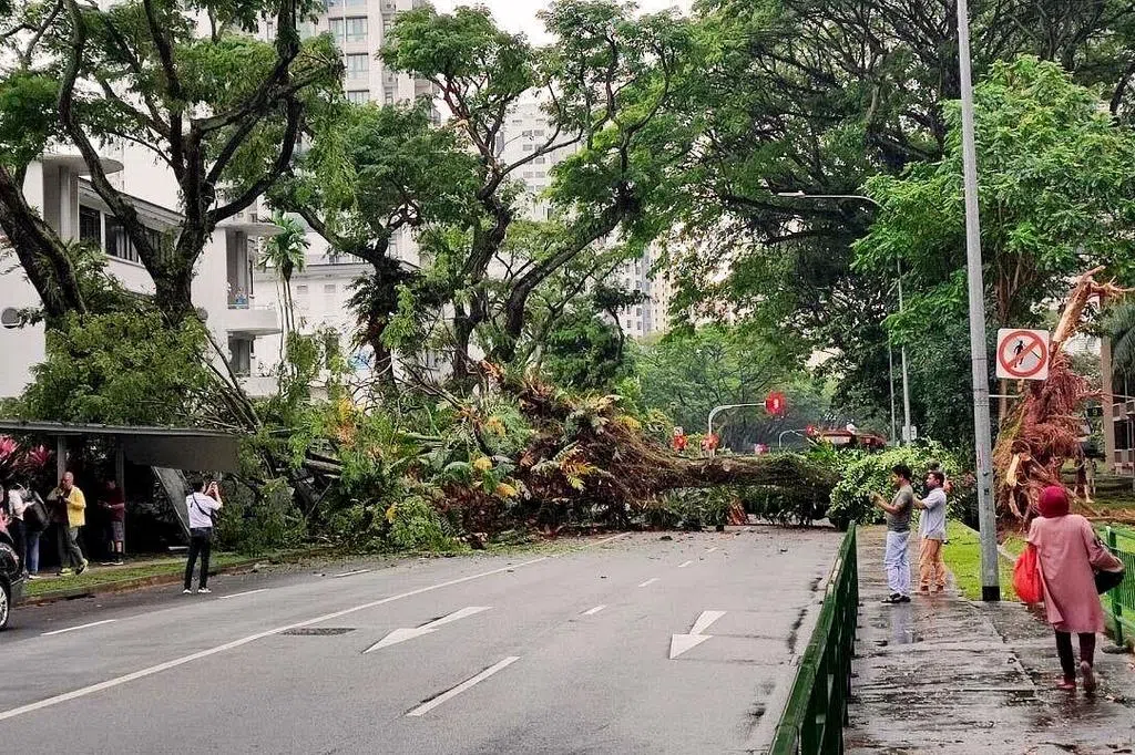 星期五(3月3日)下起长命雨,全岛湿漉漉,位于中峇鲁第7座组屋旁的一棵大树,在傍晚5时35分忽然连根拔起,倒向对街的组屋,横跨四条车道,还砸中一辆马赛地。