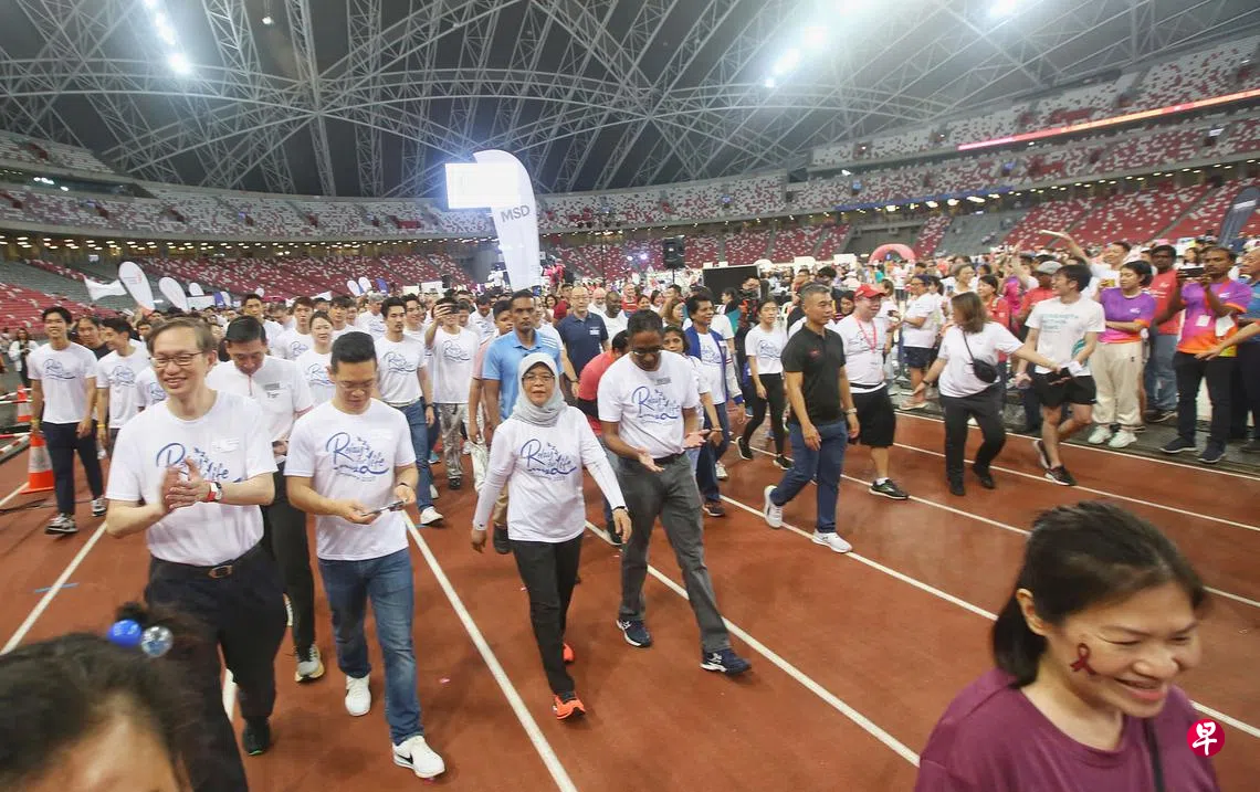 新加坡防癌协会主办的“为生命接力”筹款活动,星期六(3月4日)傍晚6时至隔天上午9时在国家体育场举行。超过4000名活动参与者在长达15个小时的活动上接力跑步,为癌患社群筹得超过110万元的善款。以主宾身份出席活动的哈莉玛总统(前排左三),为活动举行挥旗仪式后,在活动冠名赞助商TalkMed医药集团总裁洪炳添医生(左一起)、活动筹委会主席杨圣明医生以及新加坡防癌协会副会长坎斯瓦兰(Ravindran Kanesvaran)副教授的陪同下,与众人绕着国家体育馆行走,表达对癌症病患的支持。(特约陈福洲摄)
