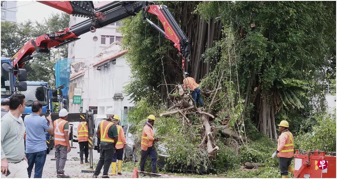 中学游学团走访甘榜格南,在具代表性的“格南树”旁拍照后,大树枝干突应声倒下砸中三辆汽车,所幸无人受伤。