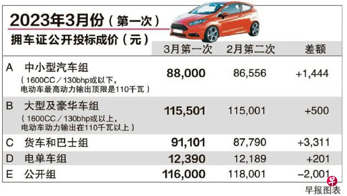 3月第一轮拥车证公开投标活动星期三(3月8日)下午结束,货车和巴士组(C组)成价上涨3311元(3.8%)至9万1101元,这已是C组成价连续三轮创新高。