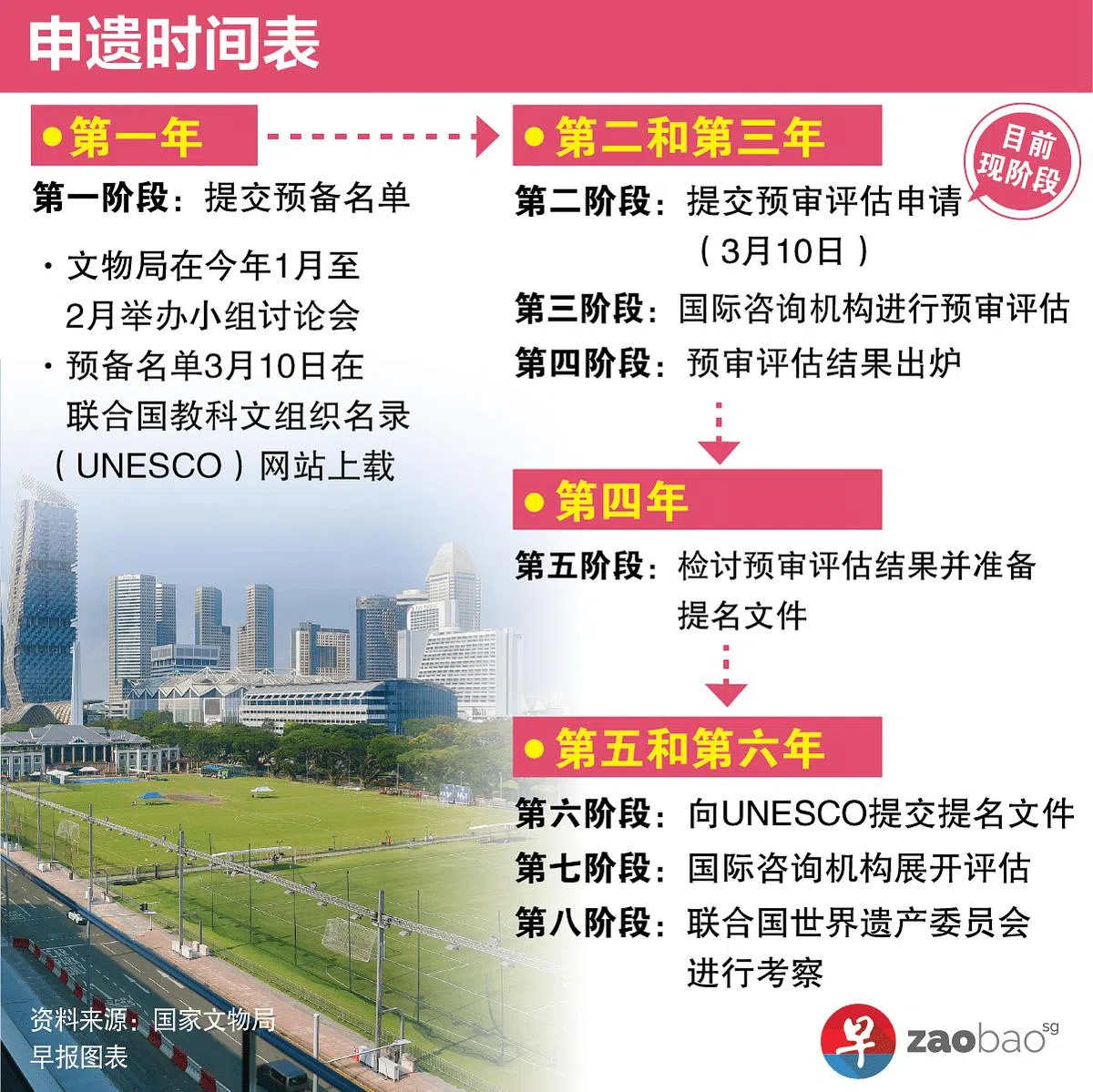 国家文物局星期四(3月9日)宣布,将政府大厦前大草场与周边建筑群(The Padang Civic Ensemble)列入联合国教科文组织名录(UNESCO)的世界文化遗产预备名单,之后开始预审评估环节,进一步研究上述地点,正式启动预计长达五六年的申遗程序。