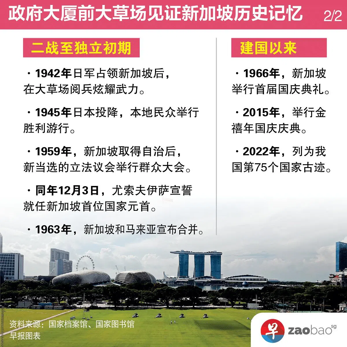 1963年新加坡和马来亚宣布合并,以及1966年新加坡首届国庆典礼,旧照片里都看得到大草场。至于建国后在大草场举办的国庆典礼,也成为不少本地民众的共同记忆。