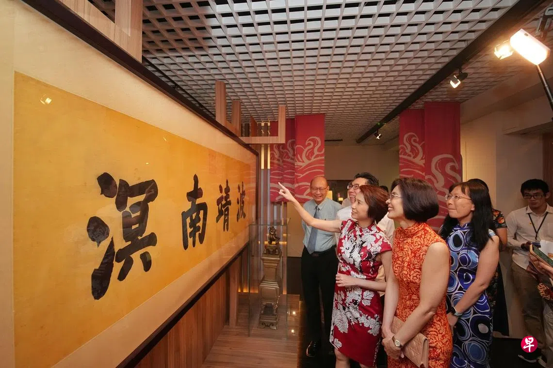 “五湖四海同心义:早期华社互助组织”特展于晚晴园——孙中山南洋纪念馆开幕。一件引人瞩目的文物是一幅由清朝光绪皇帝于1907年御赐,用来制成天福宫正殿“波靖南溟”匾额的书法原件。