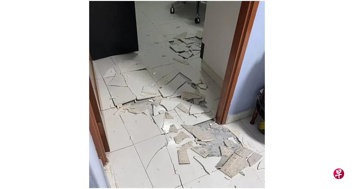 盛港一组屋半年内发生两起地砖爆裂事故,其中一个单位的地砖爆裂长达六米,一家四口慌忙跳上沙发“避险”,小孩吓哭险留阴影。