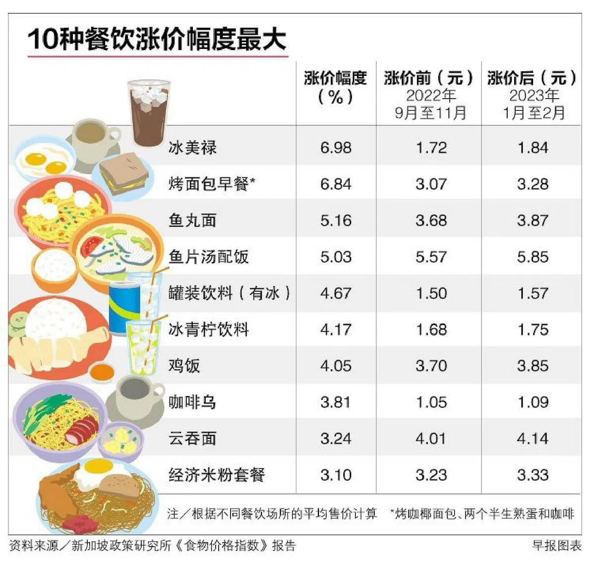 涨幅排在第二位的烤面包早餐(烤咖椰面包、两个半生熟蛋和咖啡),平均售价则从3元零7分增至3元2角8分,上涨2角1分(6.8%)。排在第三至第五位的分别是鱼丸面(5.16%)、鱼片汤(5.03%)和罐装饮料(4.67%)。