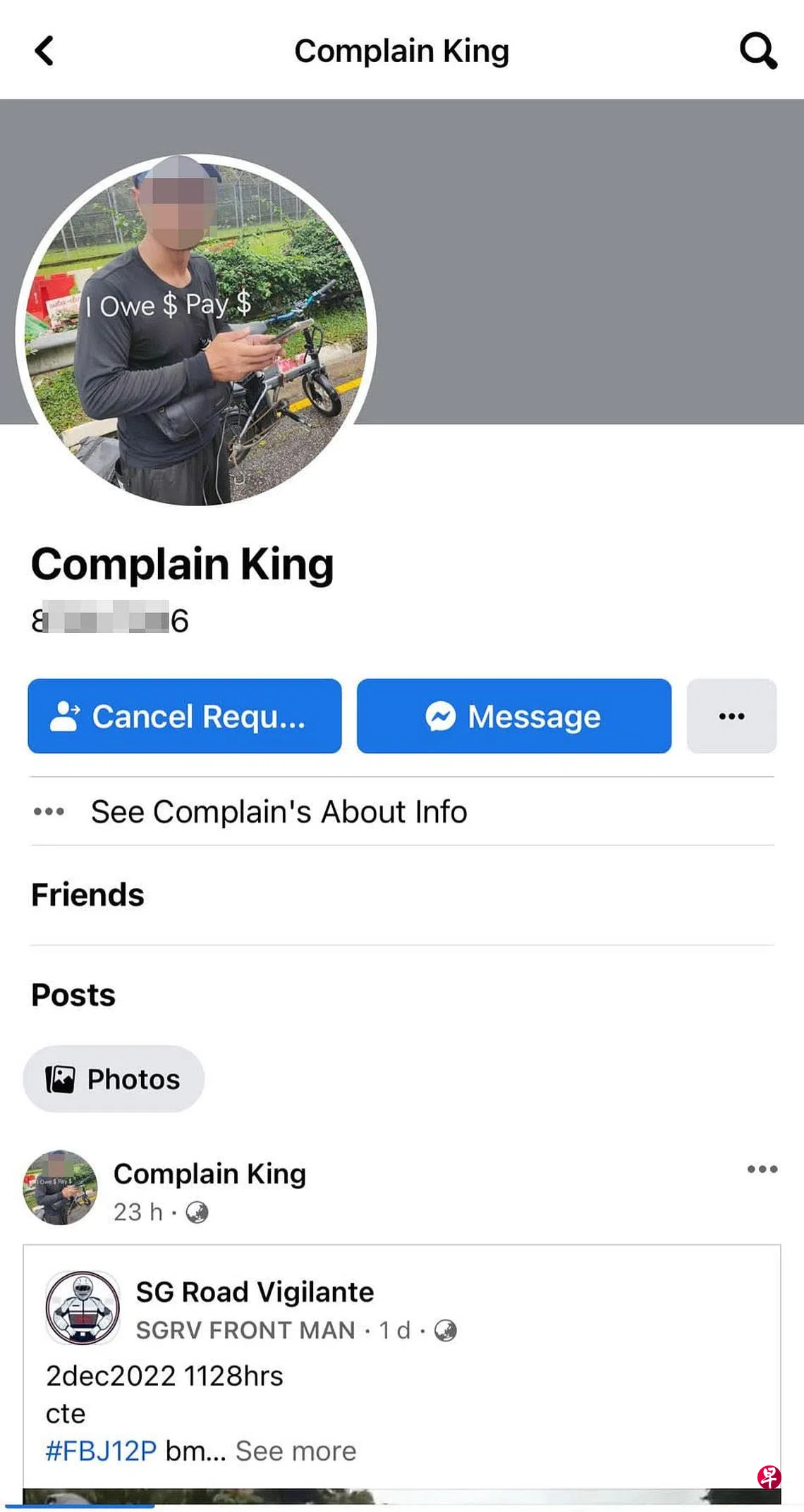 照片和手机号码被人盗用开设脸书账户,还标注上“我欠钱还钱”的字句,送餐员报警。
