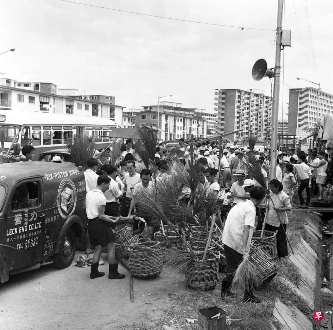 配合政府号召的“注意卫生、整顿市容”的运动,加冷旧机场住宅区超过200名居民和志愿者,1965年1月17日参加迎春大扫除活动。一群人拿起扫帚、锄头、铲子、簸箕等器具,分工合作打扫住宅区的马路、沟渠和楼梯间,展现邻里间友好睦邻的精神。