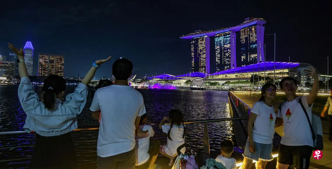 夜里亮起蓝色灯光的滨海湾金沙,呈现有别于平日的景观,吸引不少路人驻足欣赏。