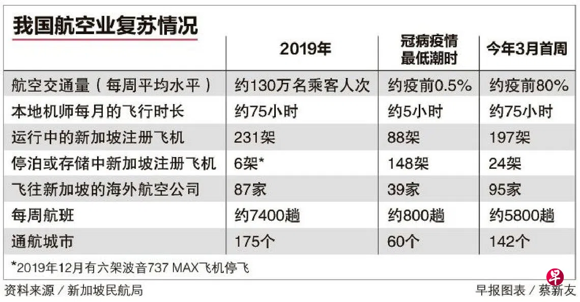 根据新加坡民航局提供的数据,新加坡航空公司、酷航和捷星亚洲这些本地航空业者旗下的机师,每月飞行时间也恢复到了疫前水平,从最低潮的五小时大幅增至75小时左右。