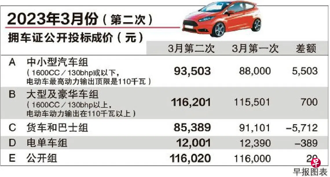 3月第二轮拥车证公开投标活动星期三(3月22日)下午结束,应付大众市场需求的中小型汽车(A组)拥车证成价上涨5503元(6.3%),报9万3503元,高于2013年1月创的9万2100元纪录。