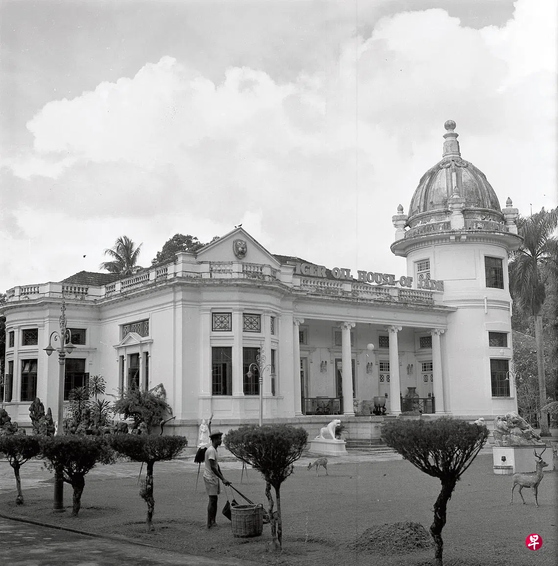 图中豪宅是《星洲日报》创办人胡文虎、胡文豹家族在乌节路纳森路3号的旧居“翠玉楼”,建于1920年代。大屋尖顶下方的虎头装饰,正是胡文虎的标志之一。