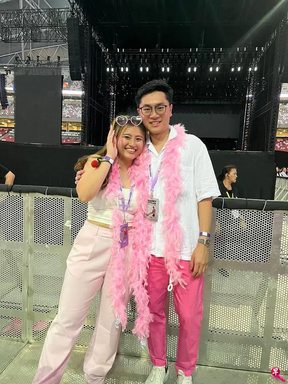 3月17日,从英国天团“1世代”(One Direction)单飞的成员哈里斯泰尔斯(Harry Styles)在新加坡国家体育场开唱。吴庆悦(25岁,销售人员)在演唱会现场向女友王丽萱(21岁,学生)求婚。吴庆悦说,女友自九岁起开始喜欢1世代,乐团解散后,她也关注成员斯泰尔斯的个人发展,是他的铁杆粉丝。
