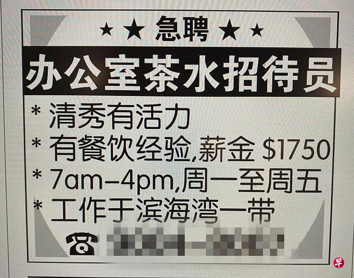 《联合早报》发现一些招聘广告带有性别歧视用语。其中一个招聘“清秀有活力”办公室茶水招待员的雇主通过电话说,公司位于滨海湾一座办公大厦内,时常有顾客上门洽谈生意,需要专门职员负责招待。