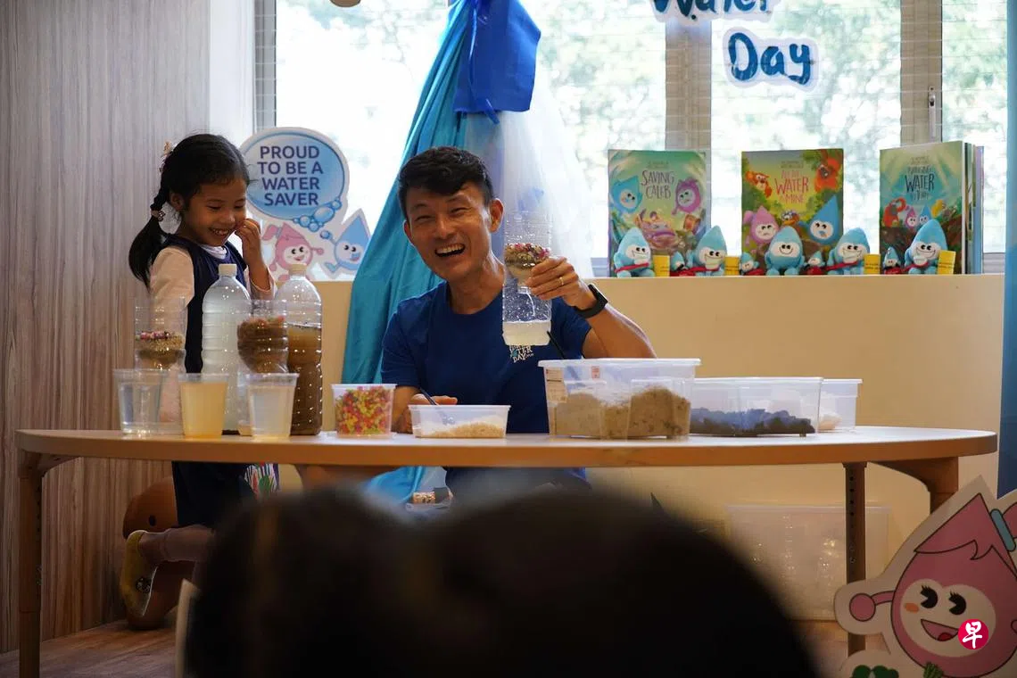 永续发展与环境部兼交通部高级政务次长马炎庆(右)日前在南艺启动装置后,到访南洋艺术学前教育学院,和小朋友们一同动手进行净水实验,用棉球、鹅卵石和沙子过滤水中的杂质,分离出更清澈、可再利用的水,让孩子们从小培养节约用水的意识。(公用事业局提供)