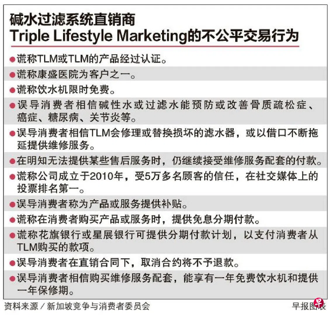 碱水过滤系统直销商Triple Lifestyle Marketing(TLM)在四年内接获近500起投诉,新加坡竞争与消费者委员会介入调查后,向国家法院申请禁制令,法庭在今年2月裁决禁止这家公司进行出售碱性滤水系统和相关维修服务配套的不公平交易行为。