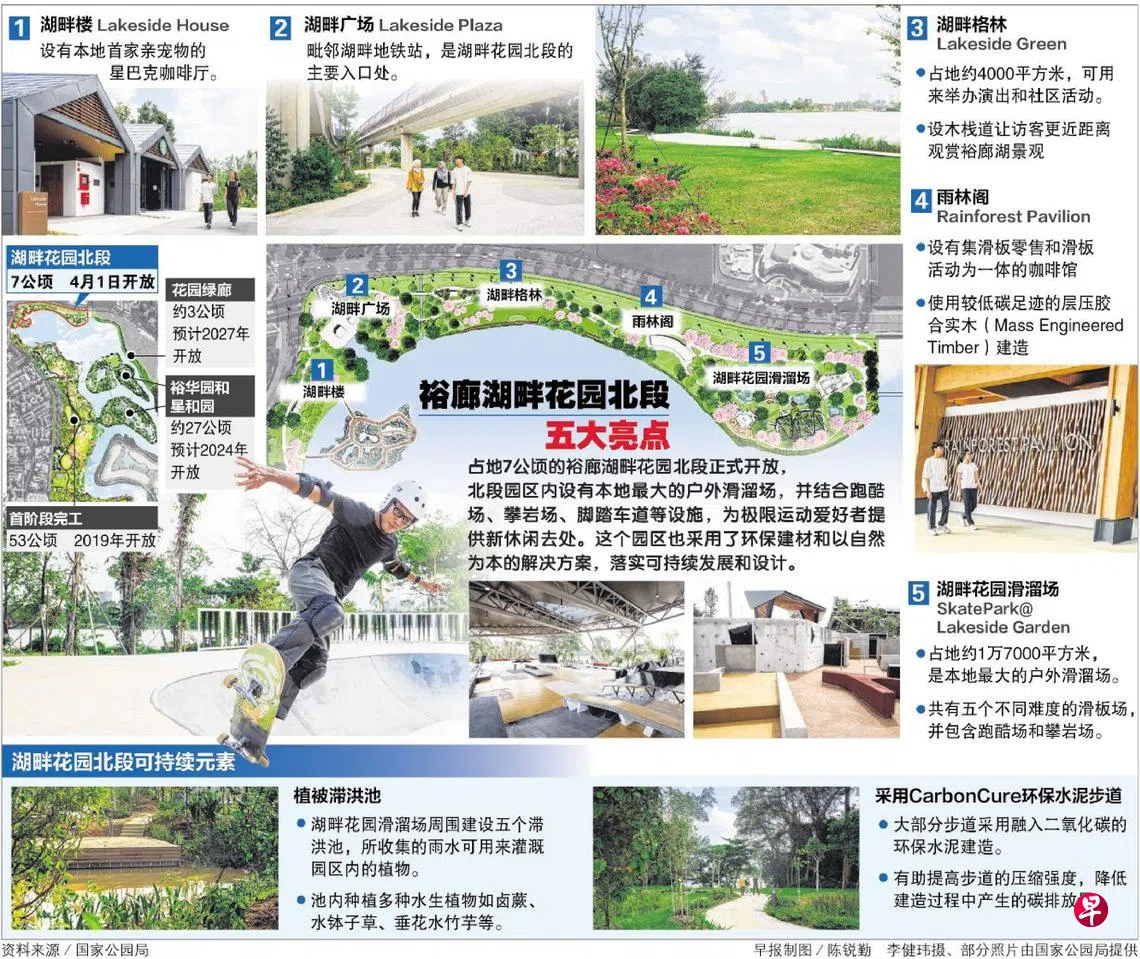 占地7公顷的湖畔花园北段星期六(4月1日)正式开放。湖畔花园北段内几乎所有步道都采用CarbonCure环保水泥制成。这一技术通过将二氧化碳转化成可嵌入水泥结构的纳米矿物质,从而提高建筑的压缩强度,同时降低建造过程的碳排放量。