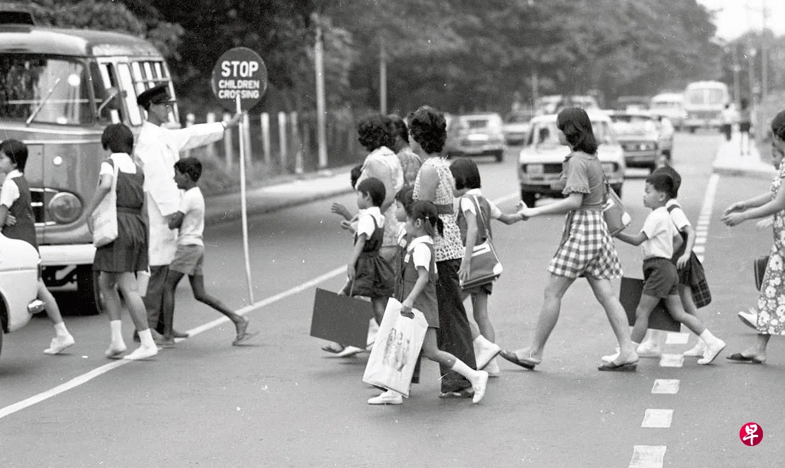 1976年1月2日开学首日,新年第二天,在度过六周漫长假期后,50多万名学生又穿上校服,开始返校上课。交管员手持“停车让行”指示牌,帮助学生及家长快速安全地穿过马路进入校园。