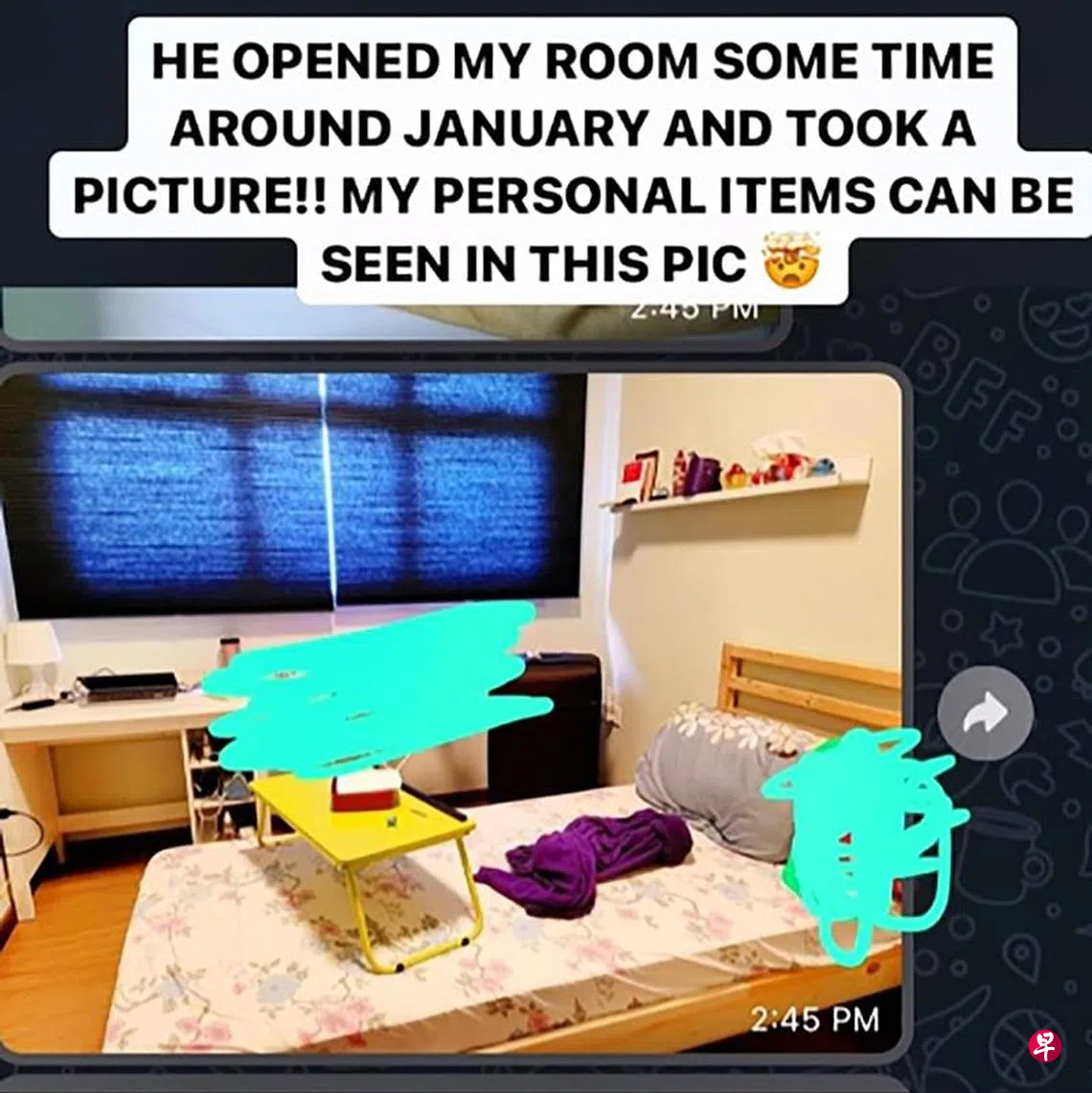 Tiktok用户“hangrihelen”两天前上传一则视频,指自己之前在义顺租房期间,男房东偷偷进房间拍照,还发邮件给她的学校要求提供她的信息,搬走时指她因之前没归还碗盘,不愿意归还押金。