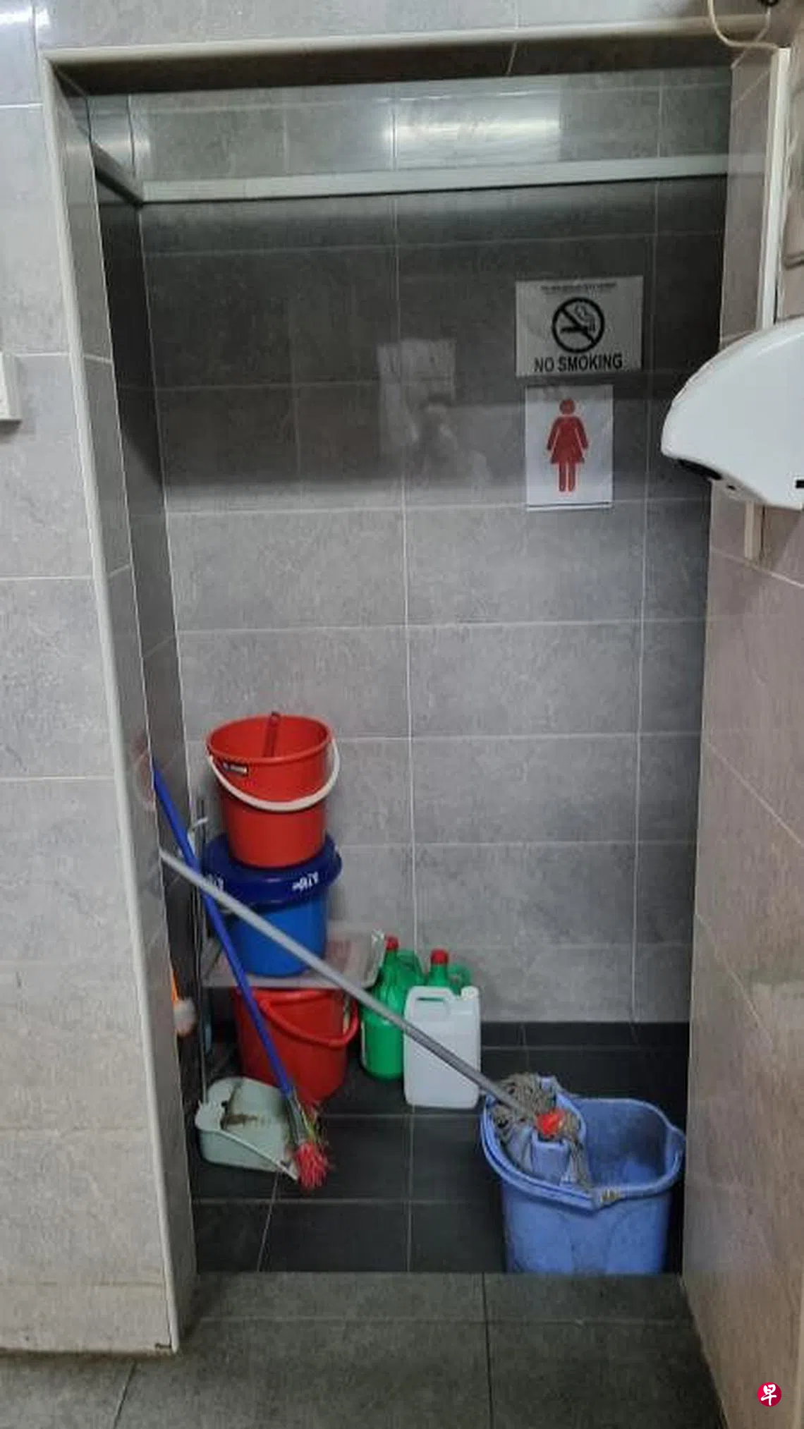 《新明日报》记者星期一(4月3日)晚走访咖啡店,发现男厕的隔间和尿斗如常开放,但女厕不但没有亮灯,入口处还摆着水桶和拖把,阻止公众进入。