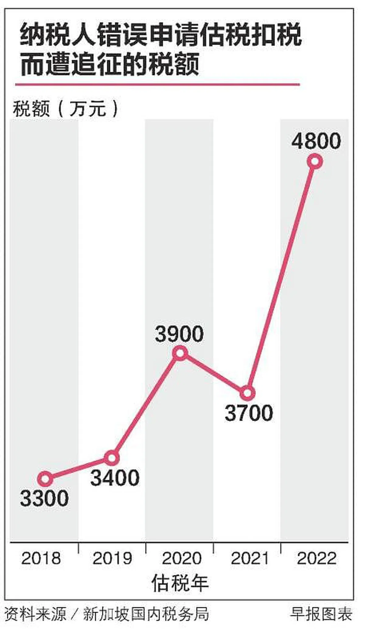 根据税务局提供给《联合早报》的数据,纳税人在2018估税年因错误申请估税扣税(tax relief)而须补缴的税额为3300万元,在2021估税年达到3700万元,去年更增三成至4800万元。