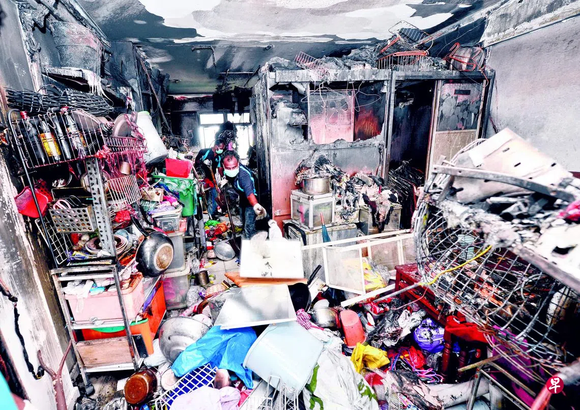 六旬妇女在武吉巴督火患中丧命,调查显示火势可能是因为烟蒂接触组屋外堆积的杂物后起火狂烧。