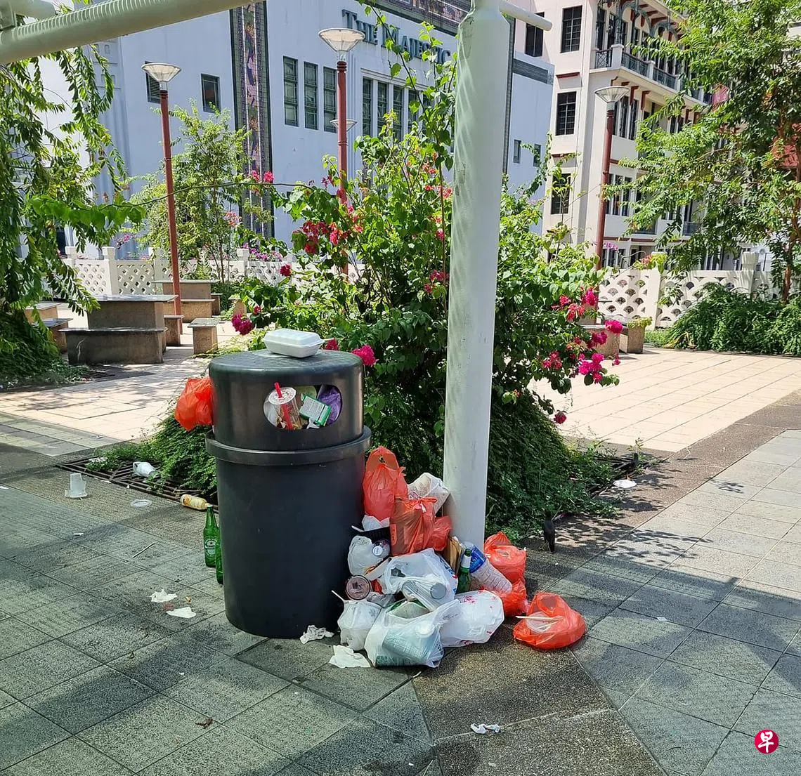 《联合早报》读者黄文德(72岁,退休人士)星期二(4月4日)下午1时左右经过牛车水花园天桥时,发现桥上的三个垃圾桶塞满垃圾,四周地板留下不少垃圾袋和餐盒,明显有人因为垃圾桶已经“超载”而随地乱丢。