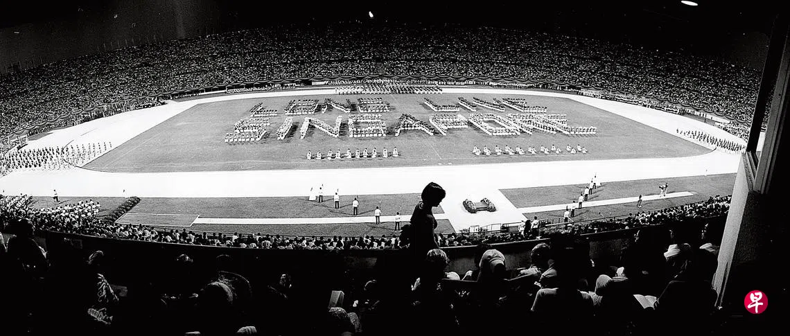 带着白手套、荷着长枪的武装部队女兵经过观礼台时,掌声雷动。根据当时的报道:“这支巾帼不让须眉的娘子军,平时除了处理办公室文书之外,还要经过严格步操与使用枪械的操练。”照片里,可以看到表演队伍排出了“新加坡万岁”的阵型。