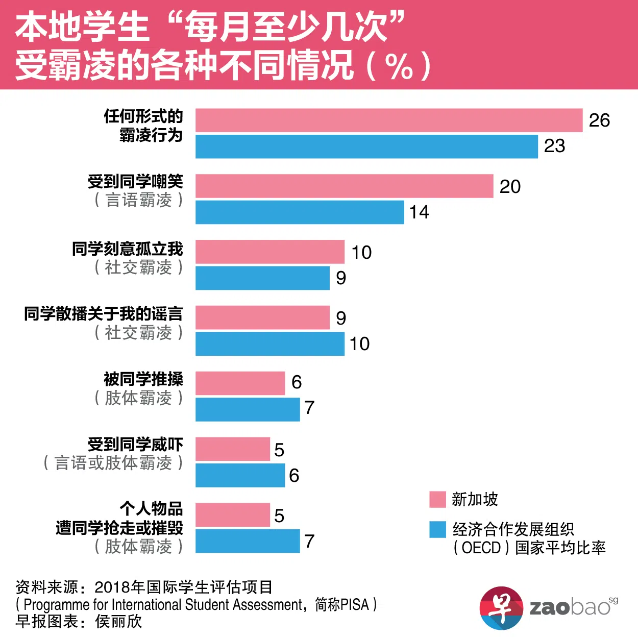 国际学生评估项目2018年发表的研究报告显示,受调查的6000余名本地15岁学生当中,26%透露每月经历数次不同形式的校园霸凌,比率比国际平均比率高出三个百分点。 曾遭受霸凌的学生当中,最常见的霸凌方式就是言语霸凌。