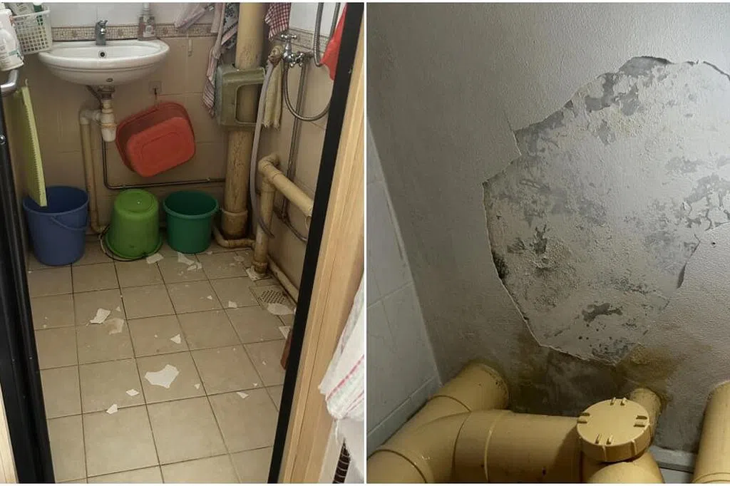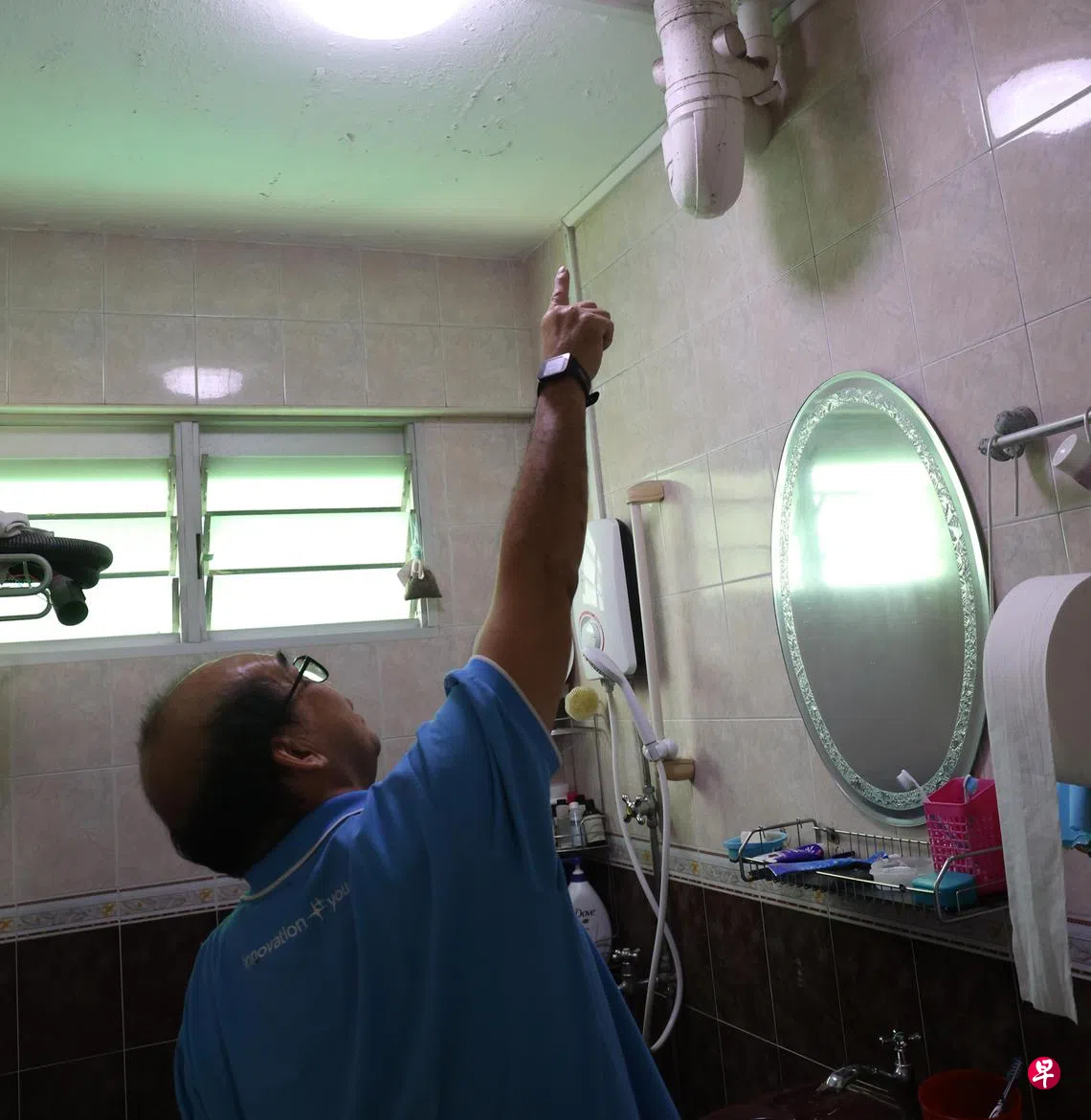 事主傅玉润(65岁,电视技工)告诉记者,他居住在武吉班让柏提路(Petir Road)第211座组屋30多年,主人房厕所的天花板最近有碎块掉落。