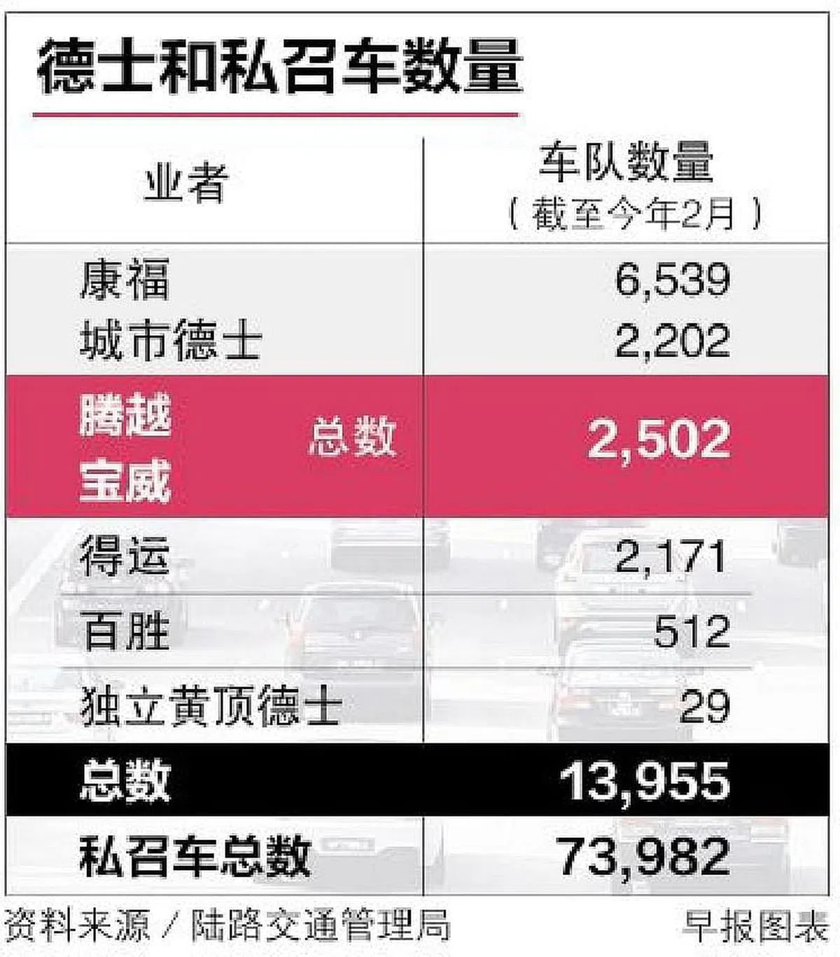 新公司将在今年5月正式成立,车队超过2500辆。到时,腾越宝威的车队将超越得运(Trans-cab)德士,成为本地第二大德士运营商。